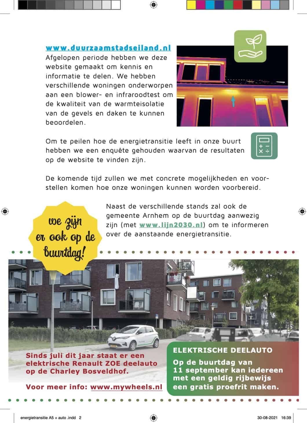Naschrift: bovenstaande folder is huis-aan-huis bezorgd in de hele wijk. Helaas was het op dat moment nog niet bekend dat de gratis proefritten met de electrische deelauto misschien niet mogelijk zijn vanwege op dit moment nog ontbrekende verzekeringsdekking. In ieder geval kan de electrische deelauto, een Renault Zoe wel bekeken worden. En kun je een demonstratie krijgen van de app waarmee de auto gereserveerd en geopend kan worden.