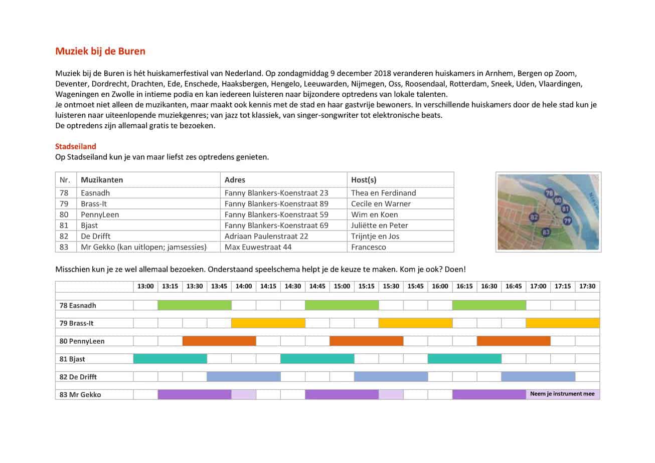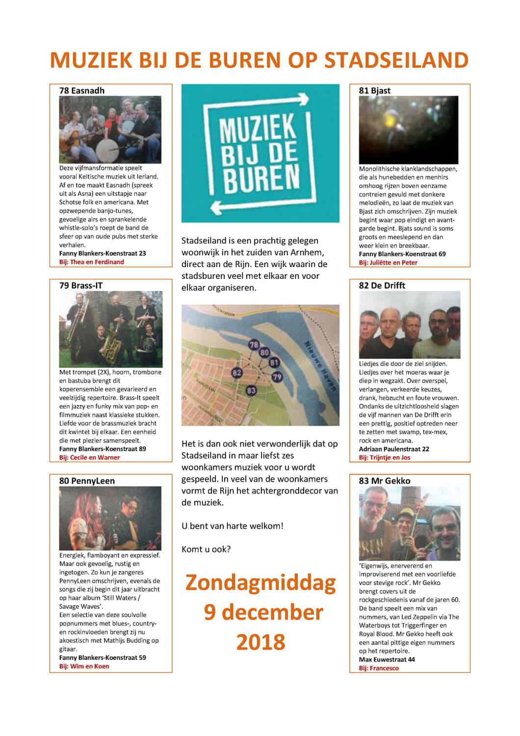 Het wordt dit jaar weer een grote happening. Hadden we vorig jaar vijf, nu hebben we zes huiskamers, in en rond de Fanny Blankers Koenstraat. 18 november worden de muzikanten bekend. Een gevarieerd programma komt er aan. Houd Facebook in de gaten en save the date. Zondag 9 december van 13.00- 17.00, per huiskamer drie optredens van een half uur. Tegen die tijd ontvangt iedere Stadseilander het blokkenschema in de bus.
