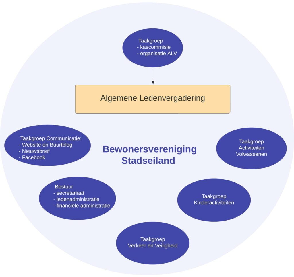 Zoals bijvoorbeeld de organisatie van de algemene ledenvergadering. En de activiteiten voor volwassenen. Een andere groepje doet de activiteiten voor de kinderen. Ook de communicatie kan zo worden aangepakt. Elk groepje hoeft maar uit 1, 2 of 3 leden te bestaan, bij de uitvoering is er altijd wel hulp te vinden in onze solidaire buurtgemeenschap.