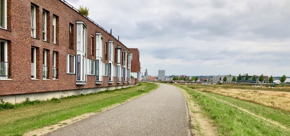 De recreatieve zone zie je hier aan de linkerkant van het fietspad. Breedte circa 35 meter.